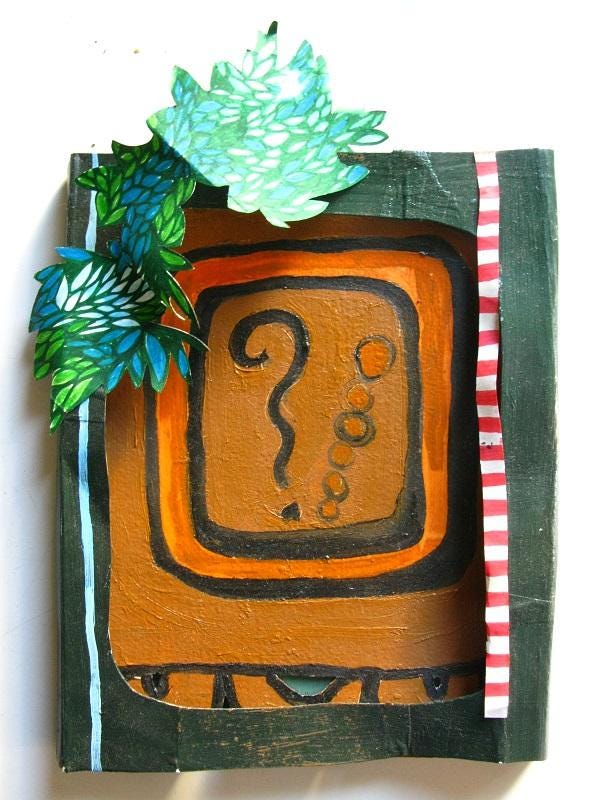 I’m neither a student nor descendent of Mayan glyphs. Pero the mystery suggested in caban imprinted on my psyche like the afterglow of chlorophyl. It lingered long after I’d closed the book. I painted caban as meditation, put it in a leafed cut-out holder, and brought it to class. “This is the Original Glyph, OG, it’s my guide.” Glyphs reach before limitations of words and pull primordial meaning to the forefront.