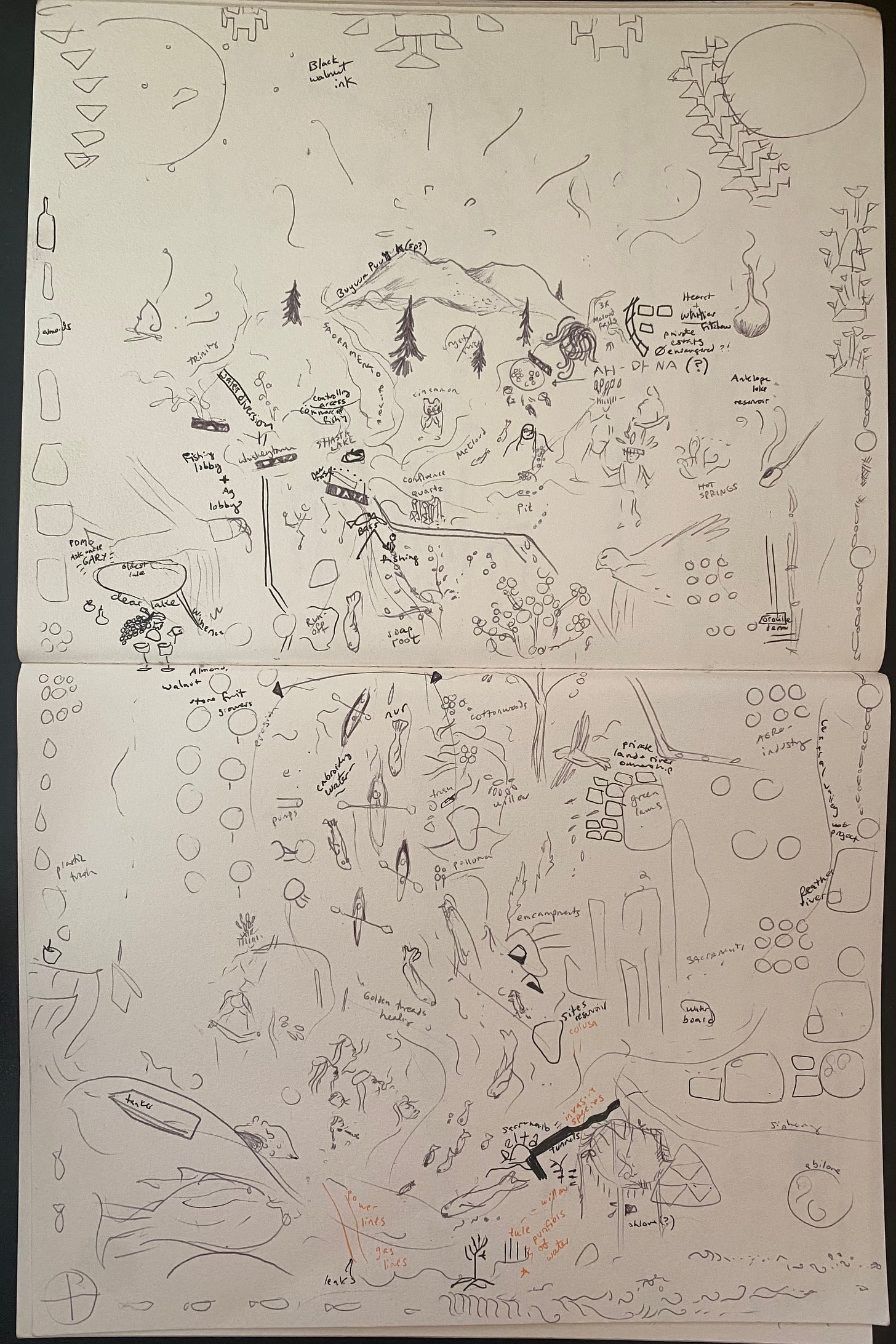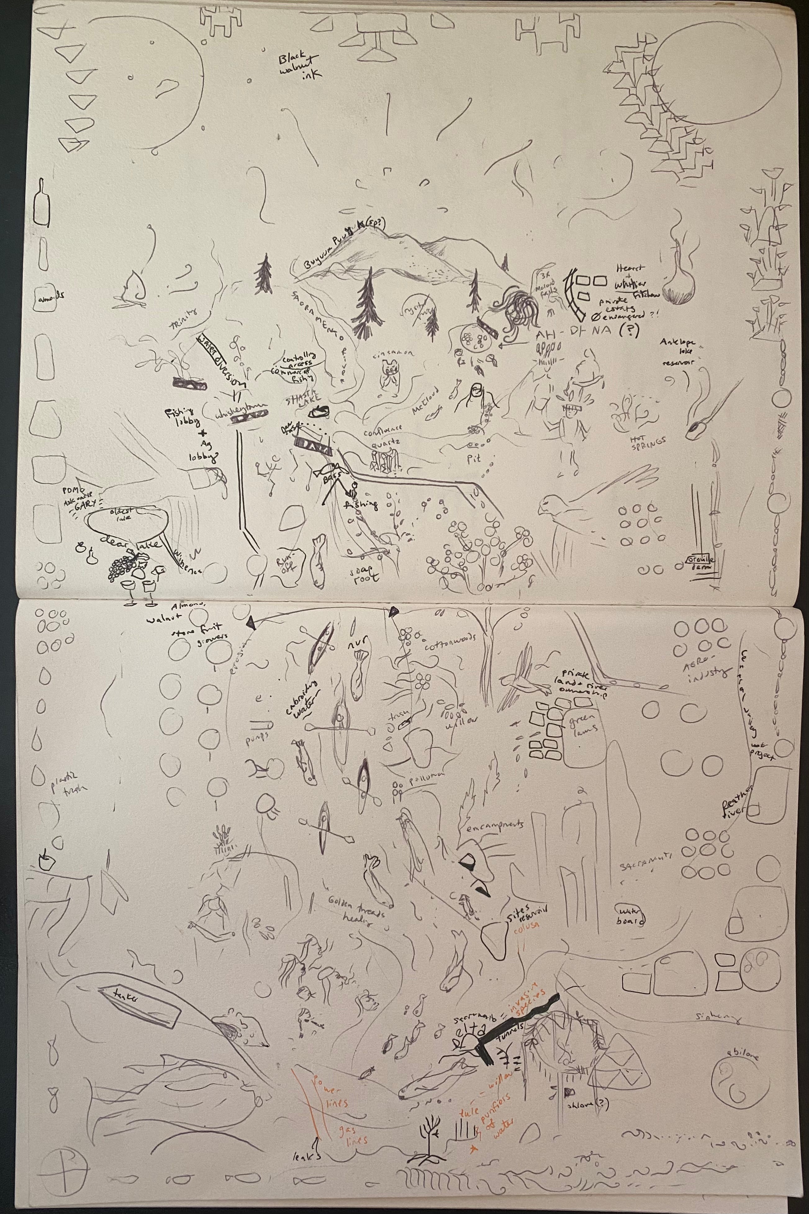 Due to the construction of the Shasta Dam in the 1930s, the Winnemem Wintu’s villages were flooded and the salmon haven’t been able to return to their spawning grounds. The lifecycles of so many beings, including humans and whales, have been drastically impacted by the dams and subsequent colonial water management still wanting to raise the dams even more, today. The environmental and cultural devastation is drastic.
