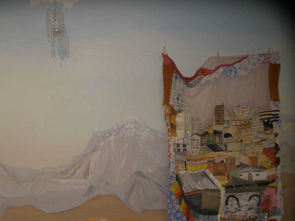 Sarita with collaged paintings of bricolage, multiethnic place, an altar detail inside the studio holding spiritual center amidst psychological attacks, a built-in bed turned tapestry-world to understand my place, research at home, Flower Mountain from scrap papier-mache over the loft to invite the Mexica ancestral realms of Atzlán into the work, 2010